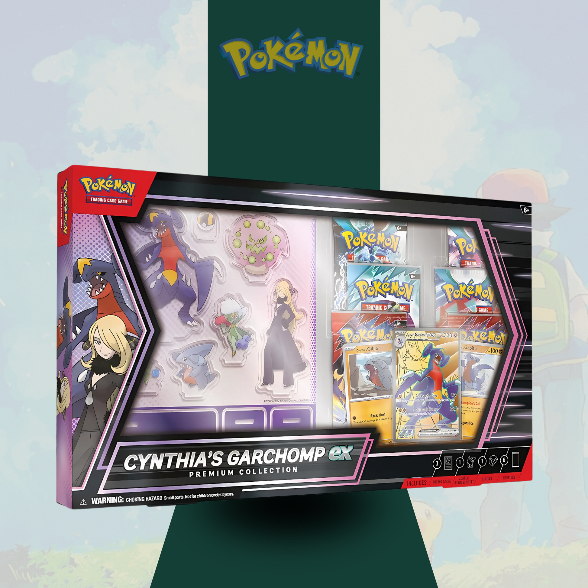 The Pokémon TCG: Cynthia’s Garchomp ex Premium Collection includes: