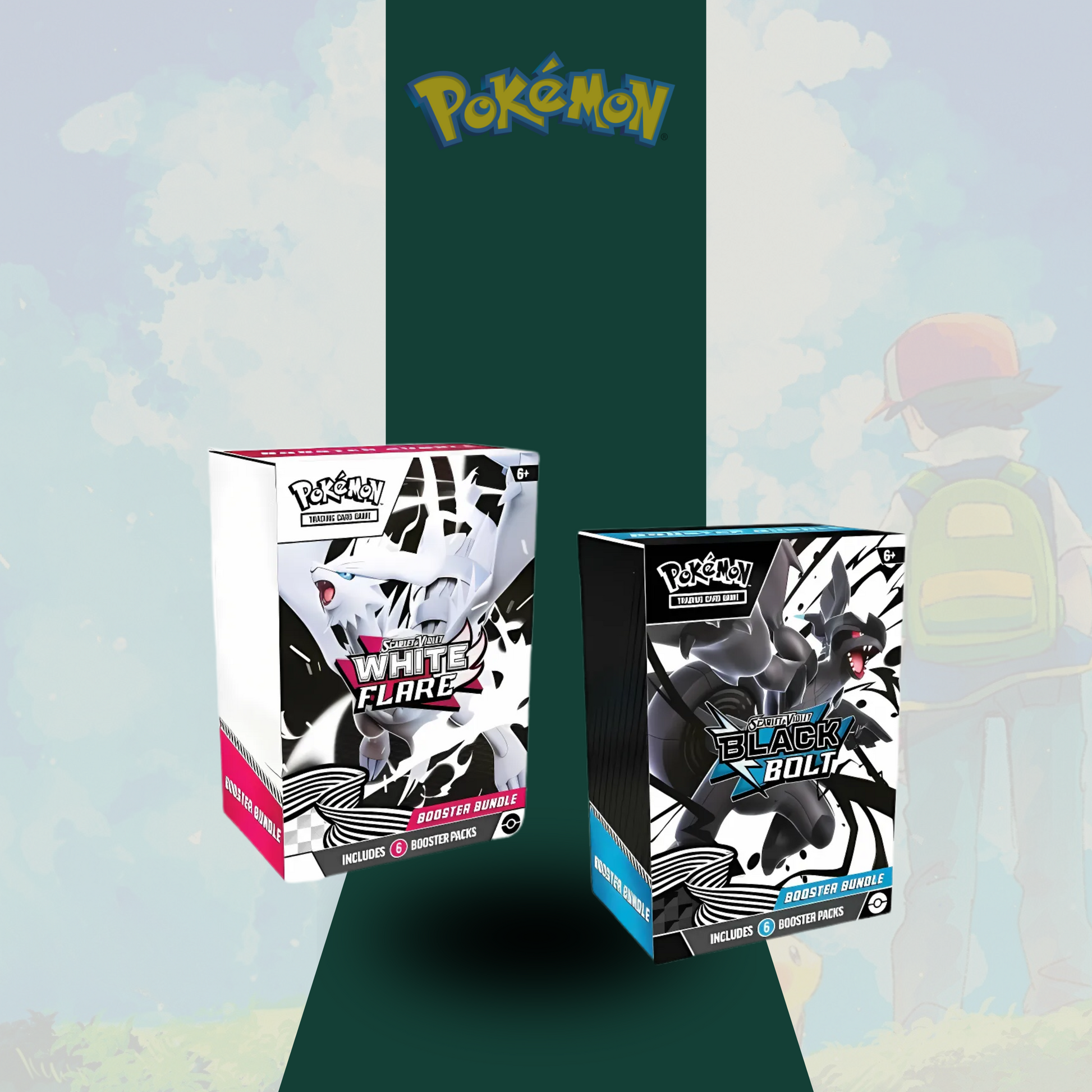 In the Pokémon TCG: Scarlet & Violet—Black Bolt expansion, evolve first partner Snivy all the way to Serperior ex, and discover the inspiring power of ideals with the region’s Legendary and Mythical Pokémon, including Zekrom ex and Meloetta ex. With the Pokémon TCG: Scarlet & Violet—White Flare expansion, evolve first partners Tepig and Oshawott all the way to Emboar and Samurott, and discover the undeniable power of truth with the region’s Legendary and Mythical Pokémon, including Reshiram ex and Keldeo ex. As you fill out your Pokédex, keep an eye out for full-art illustrations of each Pokémon and cards with premium parallel Poké Ball patterns. Expand your collection with a Booster Bundle containing six booster packs from the Pokémon TCG: Scarlet & Violet—Black Bolt expansion or a Booster Bundle containing six booster packs from the Pokémon TCG: Scarlet & Violet—White Flare expansion.